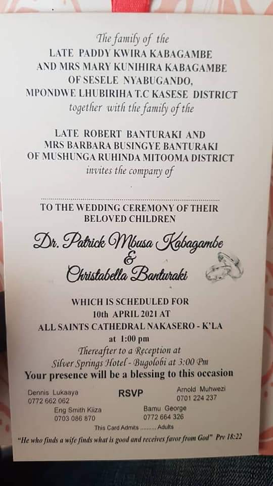 But in a message on Sunday, Dr. Kabagambe said “there was no picking up of the bride, no guests were expected to turn up. I cancelled the wedding on Thursday 8th April, 2021. All key stakeholders had been made aware of my intentions.”