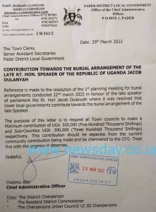 “It was resolved that lower local governments contribute towards the burial of the Speaker, ” Mr Alex Chelimo the CAO, Pader wrote to town clerks of town councils in Pader in a March 29 letter.