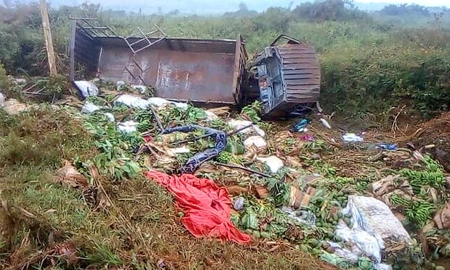 Police says that a black Fuso Fighter motor vehicle, registration UAY 415C, loaded with Matooke experienced a brake failure thereby losing control.